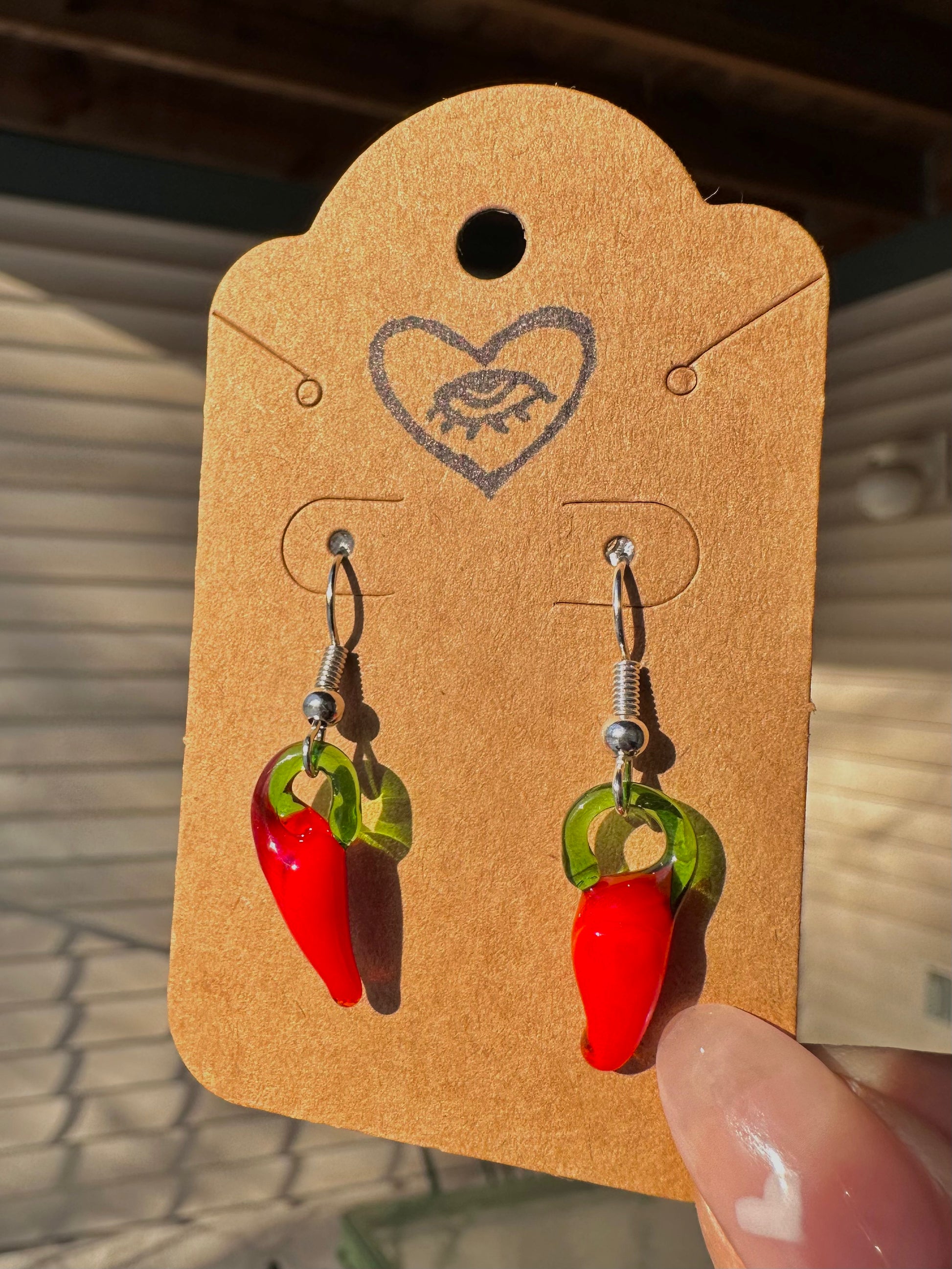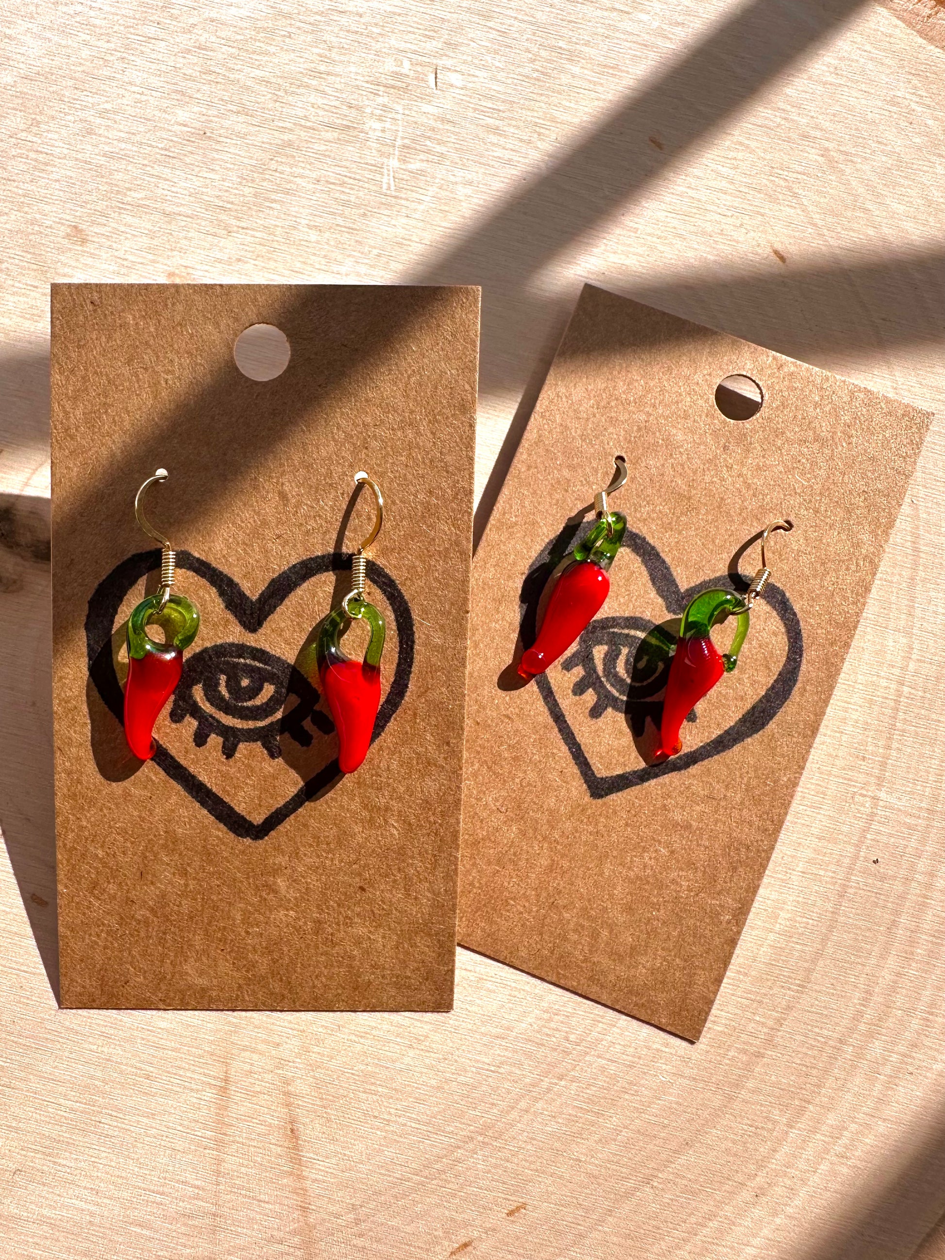 - vibrant miniature chili pepper earrings, glass blown and available in both non tarnish gold and silver!