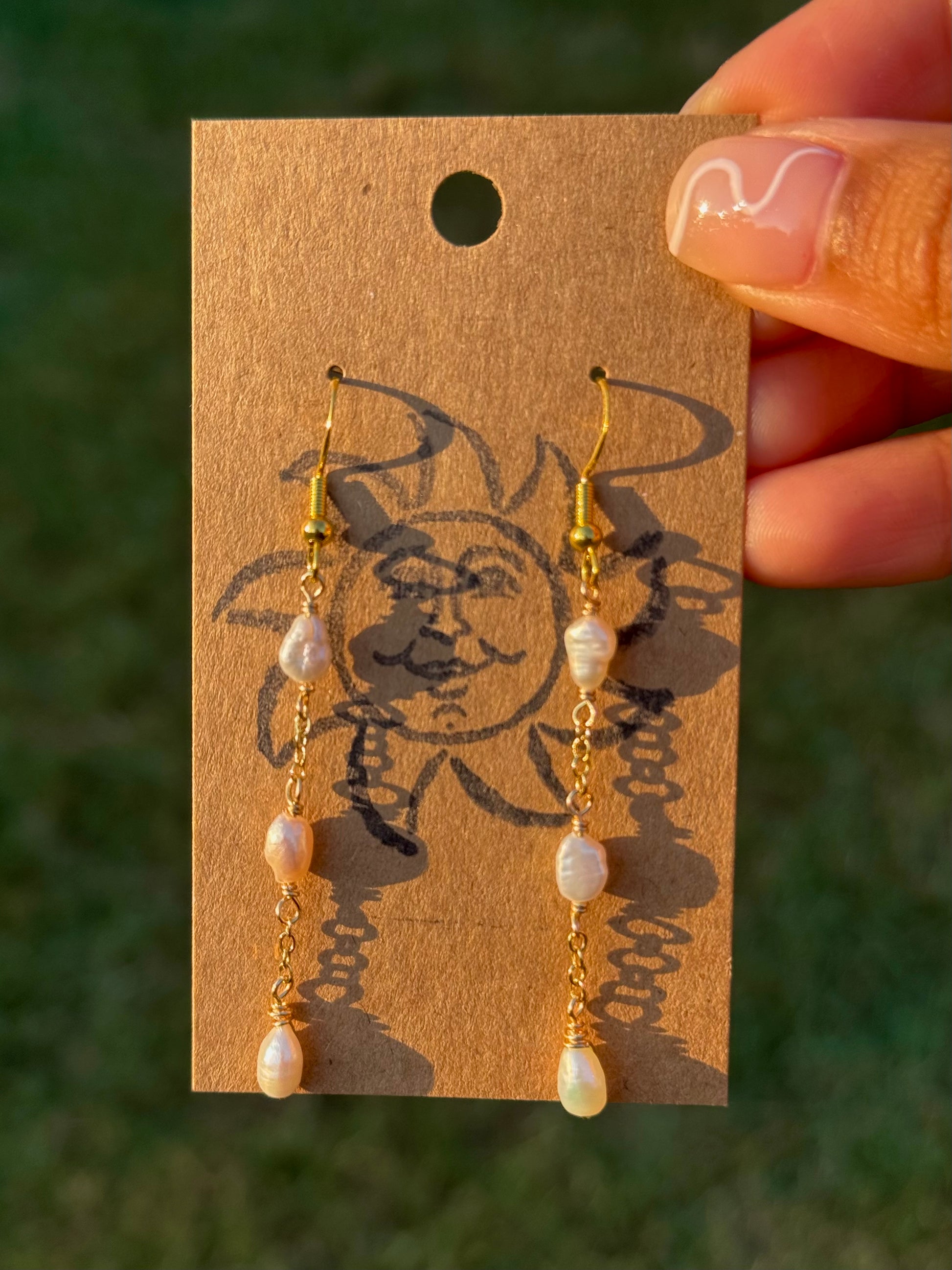 long and dainty, simple pearl look containing three small pearls connected to an even daintier chain!