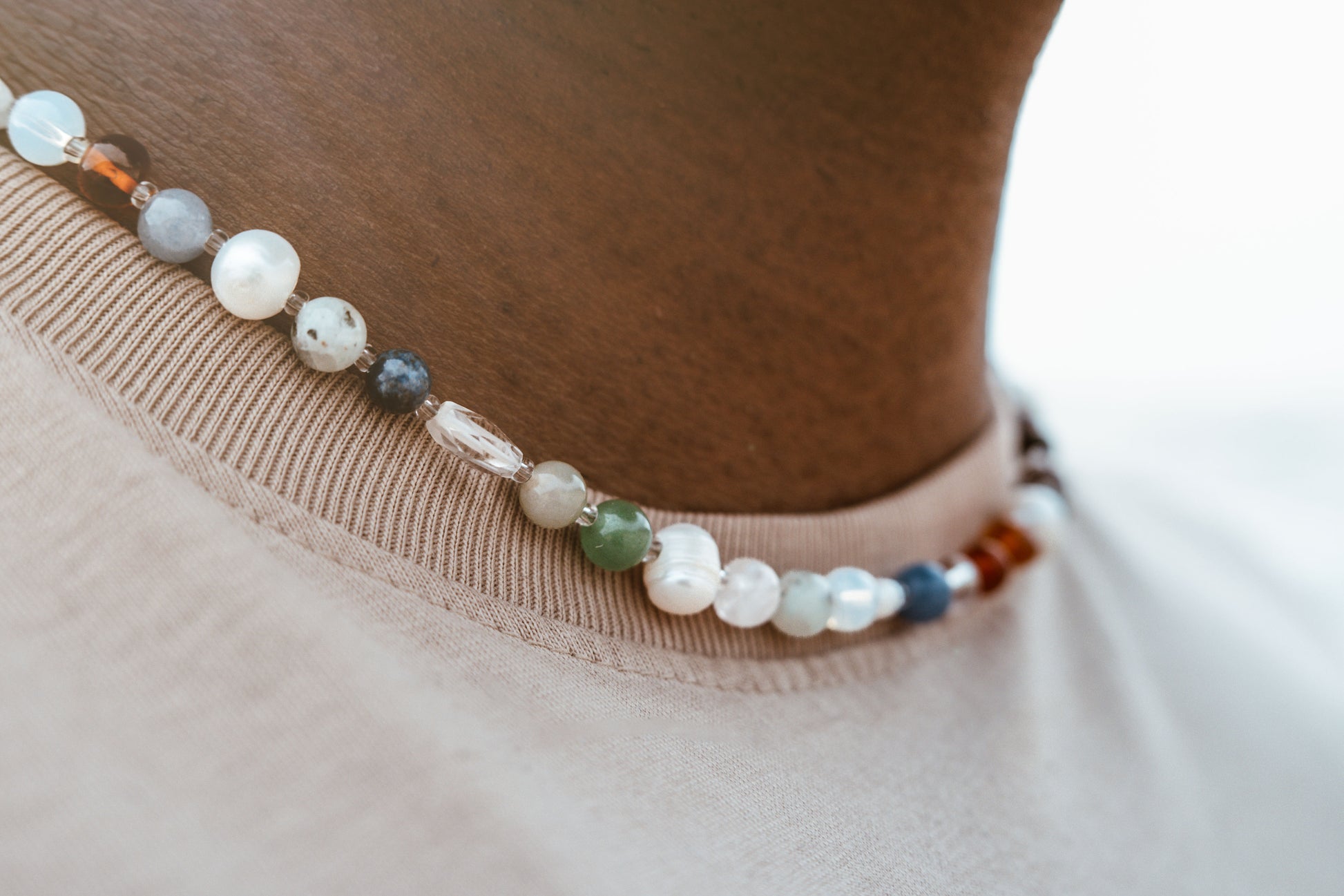 each necklace is entirely unique in its pattern of crystal beads and pearl grooves for a modern boho representation of grounded nature and colorful elegance!